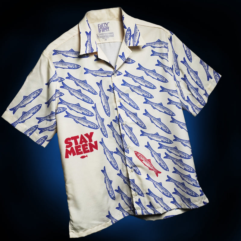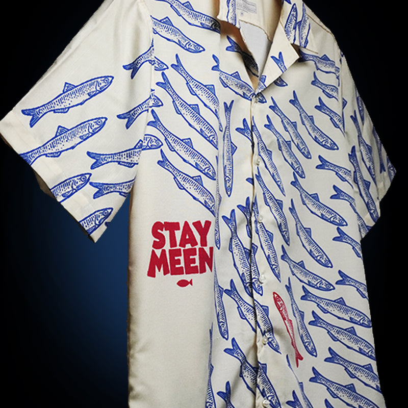 Stay Meen is the rebel yell of the sea, featuring a bold red meen doing its own thing while the blue fish follow the crowd.